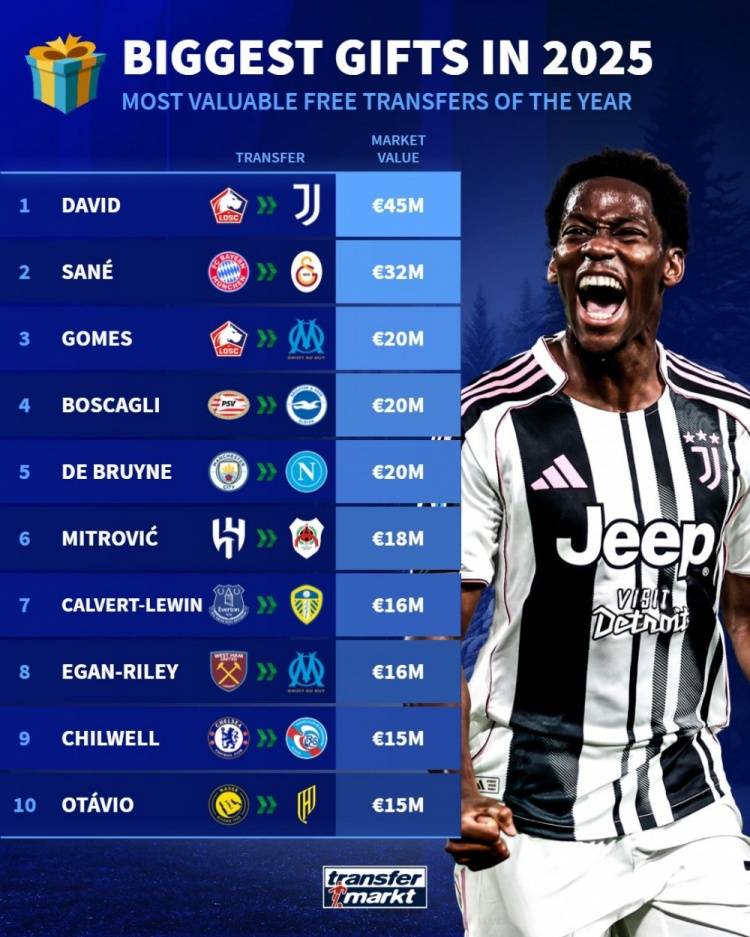 24直播网北京时间12月26日,德国《转会市场》给出了2025年自由转会球员目前的身价排行榜,尤文的乔纳森-戴维以4500万欧居首,加拉塔萨雷的萨内3200万欧次席。